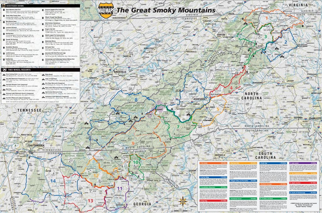It covers the entire Smoky Mountains region and much more. This map features a curated collection of captivating points of interest along the way for the road traveler in all of us. Highlighting the best 36 adventure rides with routes spanning from East of Nashville, TN to West of Wilkesboro, NC, South of Lexington, KY to North of Gainesville, GA.